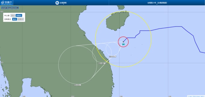 この情報によりますと、現在、「南シナ海」の海上にある台風24号は、今後もゆっくりと南下していき、23日にベトナムに上陸して、そのまま「熱帯低気圧」に変わる見込みです。
