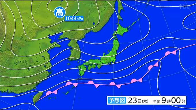 秋雨前線は南下するでしょう。本州付近は、大陸に中心を持つ高気圧に緩やかに覆われる見込みです。