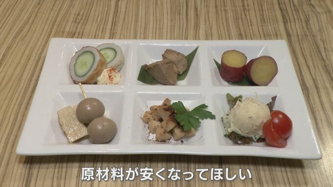 「これは日本酒のつまみ。キュウリ、マグロ、サツマイモ、ウズラ、チーズ…全てが去年に比べて1.2倍~1.5倍にあがっている」