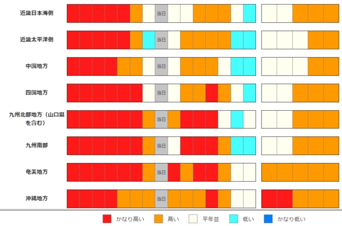 沖縄・奄美の向こう2週間の気温は、暖かい空気に覆われやすいため平年並か高く、かなり高い日もあるでしょう。農作物の管理等に注意してください。