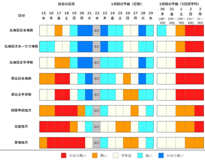 ・2週目の予報は中心の日に前後2日間を加えた5日間の平均(平均気温の5日間平均)です。平均期間は中心の日の下に表示しています。2週目のかなり高い(かなり低い)は、かなり高い(かなり低い)気温となる確率が30%以上のときに表示します。