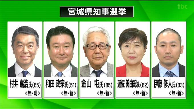知事選に立候補しているのは、届け出順にいずれも無所属で、6選を目指す現職村井嘉浩氏(65)、元参議院議員の新人和田政宗氏(51)、自営業の新人金山屯氏(85)、元県議会議員の新人遊佐美由紀氏(62)、元角田市職員の新人伊藤修人氏(33)の5人です。