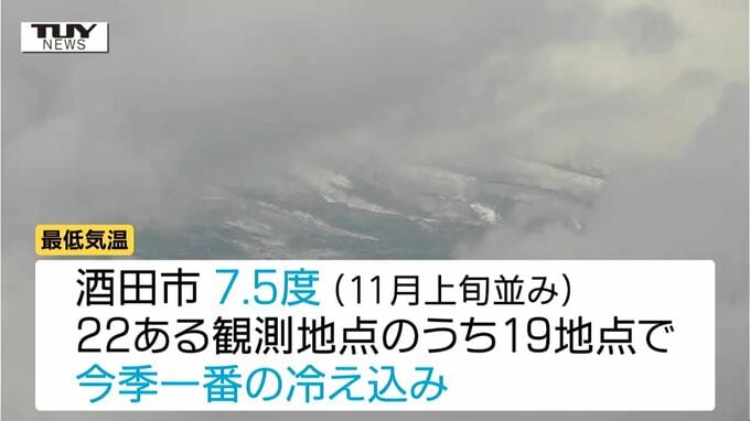 最低気温は、酒田市で7.5度と11月上旬並みの気温となるなど22ある観測地点のうち19地点で今季一番の冷え込みとなりました。