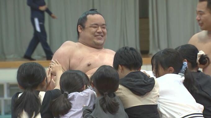 また、22日は地元の小中学校の子どもたちとふれあい朝稽古が行われ、力士と押し相撲に挑戦しました。児童や生徒は力士の身体の大きさや力強さに驚きながらも元気いっぱいにぶつかっていきました。