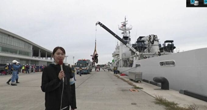 記者リポート「緊張感が漂う中、連携をとりながら機材を船上に積み込んでいます。」