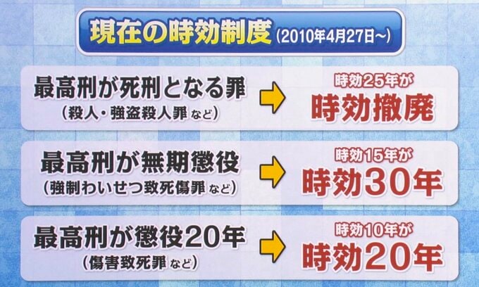 これにより「死刑に当たる重大犯罪」については公訴時効が撤廃され、同様の悲劇が繰り返されない仕組みが整えられたのです。