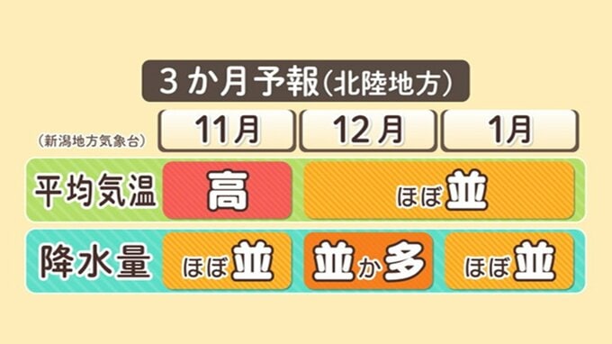 新潟地方気象台は、新潟を含む『北陸地方の3か月予報』を21日に発表しました。それによりますと、気温は11月は平年より「高く」、12月と1月は「ほぼ平年並み」。降水量は、11月と1月は「ほぼ平年並み」で12月は「…
