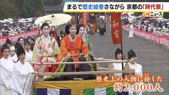 京都三大祭りのひとつ「時代祭」。歴史絵巻さながらの大行列がまちを練り歩きました。 「枕草子」の作者・清少納言に鎌倉時代の武将・楠木正成。平安時代から明治維新までの歴史上の人物に扮した約2000人が京…