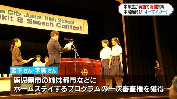各校が趣向を凝らした演劇を披露する中、最優秀賞に輝いたのは、鴨池中学校2年の宮下万慶さんと末廣心花さんでした。