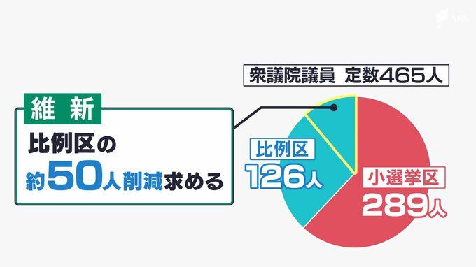 維新が掲げているのは衆議院議員465人の1割にあたる約50人の削減で、小選挙区ではなく、比例区を対象としています。