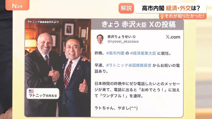 「昨晩、#高市内閣の#経済産業大臣に就任。早速#ラトニック米国商務長官からお祝いの電話あり。日本時間の昨晩中にぜひ電話したいとのメッセージが来て、電話に出ると『おめでとう!』に加えて『ワンダフル!』を連呼。ラトちゃん、やさし(^ ^)」
