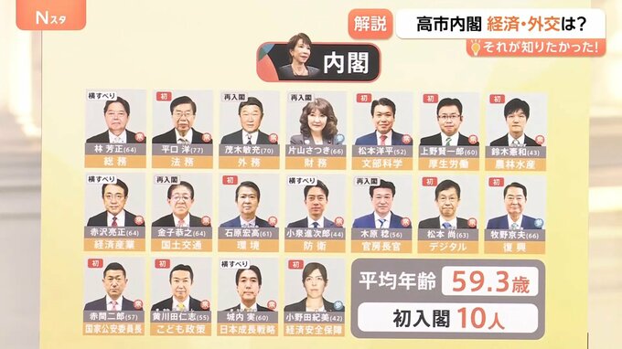 高市内閣はご覧のような顔ぶれになりました。前回の石破政権よりも、平均年齢は4歳若い59.3歳。初入閣は10人です。