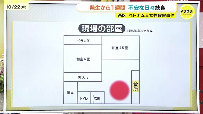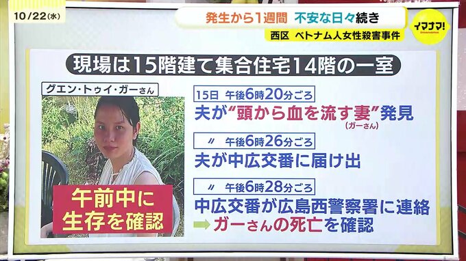 午後6時20分ごろ:帰宅してきた夫が、頭から血を流して部屋の台所付近に倒れている、グエン・トゥイ・ガーさんを発見