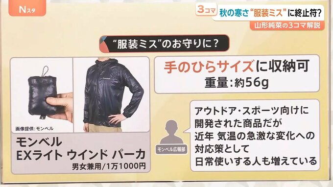 モンベル広報部によると「アウトドア・スポーツ向けに開発された商品だが、近年気温の急激な変化への対応策として、日常使いする人も増えている」ということです。色も4色くらい展開されており、使いやすそうでした。
