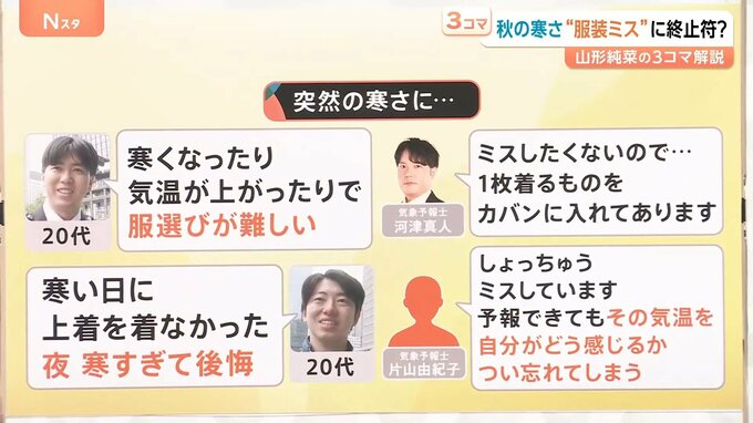 そして、急に寒くなると服装が難しくなってきます。街では「寒くなったり気温が上がったりで、服選びが難しい」「寒い日に上着を着なかった。夜寒すぎて後悔」という声が聞かれます。