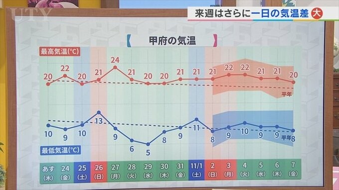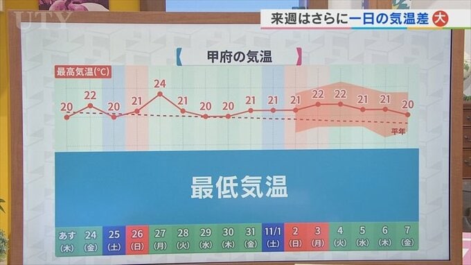 ただ、朝の最低気温は来週は地上から熱が逃げる放射冷却の影響もあって冷え込みが強まります。