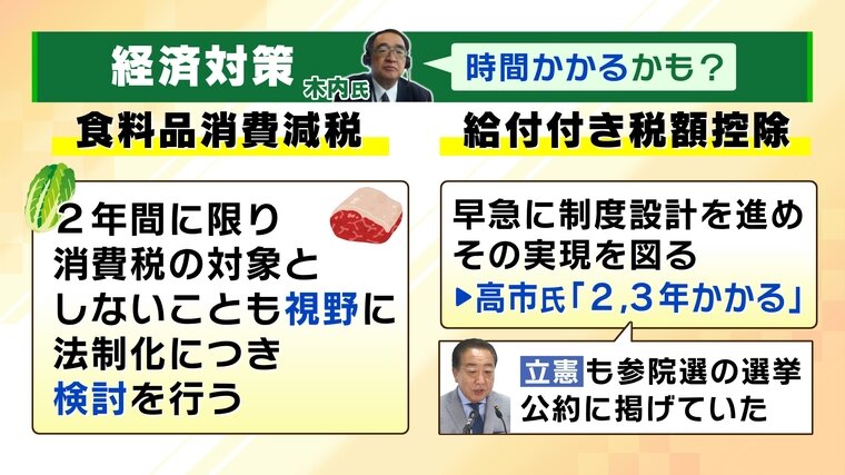 給付付き税額控除は、立憲民主党が参院選で公約に掲げていましたが、高市総理自身が「2~3年かかる」と述べていて、制度設計に時間を要する可能性があります。
