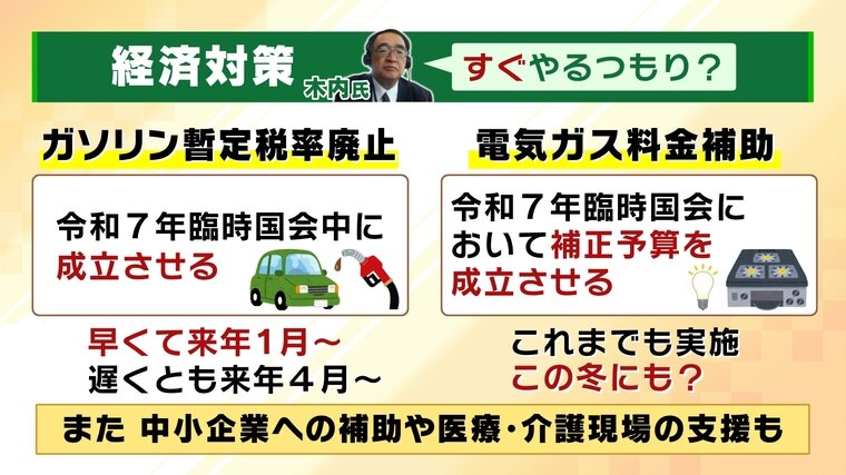 ▼電気ガス料金の補助:合意文書に「早急に取りまとめ、25年臨時国会において補正予算を成立させる」と表記
