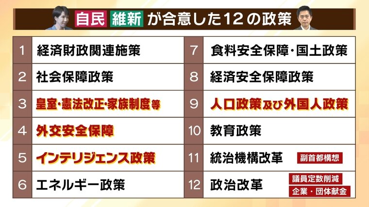 12の政策のうち「皇室・憲法改正・家族制度等」「外交安全保障」「インテリジェンス政策」「人口政策・外国人政策」はどうなるのでしょうか?合意文書には次のような文言があります。