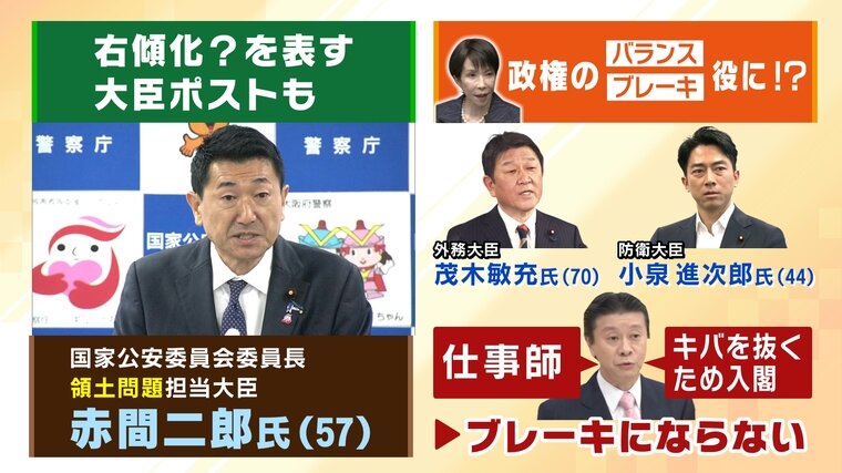 では、茂木外務大臣や小泉防衛大臣といった閣僚が政権内のブレーキ役となるのでしょうか?ジャーナリスト・武田一顕氏は「茂木氏は上から言われたことを忠実に実行する仕事師」であり、「小泉氏が仮に高市政権に物申すつもりなら、そもそもこのポストを引き受けていない。キバを抜くために入閣」と指摘。つまり、2人はブレーキにはならないと見ています。