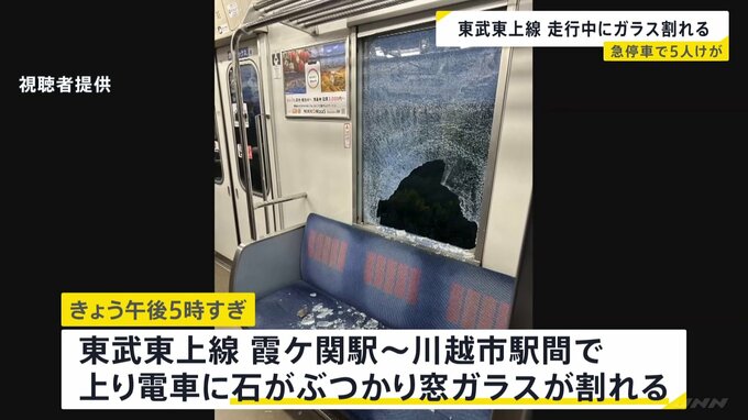 きょう夕方、埼玉県川越市で走行中の東武東上線の電車の窓ガラスに石がぶつかりました。この影響で乗客5人がけがをしました。きょう午後5時すぎ、東武東上線の霞ケ関駅と川越市駅の間で、走行中の上り電車に石がぶ…