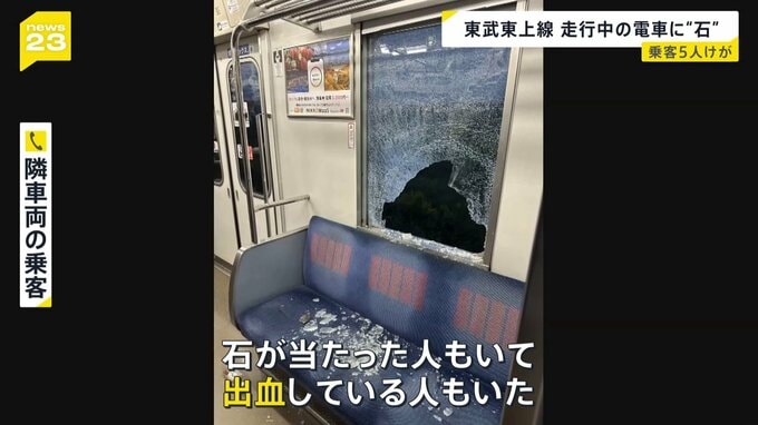 22日午後5時すぎ、走行中の東武東上線の電車の窓ガラスが割れ、乗客5人がけがをしました。警察などによると、東武東上線・霞ケ関駅と川越市駅の間を上り方向に走行していた電車が、下り電車とすれ違うように走行し…