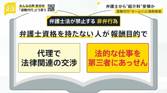 若者らを中心に利用が広がる退職代行サービス。その大手「モームリ」の運営会社などに、警視庁が弁護士法違反の疑いで家宅捜索に入りました。元従業員がJNNの取材に応じ、「違法行為を口外しないように言われていた」などと証言しました。