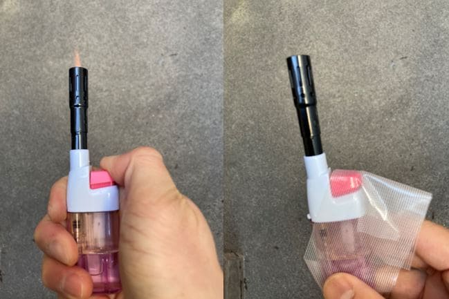 続けて、使い捨てライターのガスの抜き方について画像を投稿し、「火をつけた後に息をかけて消して、テープでとめるとガスが抜けます。」と紹介しました。