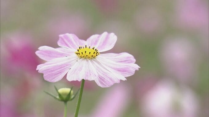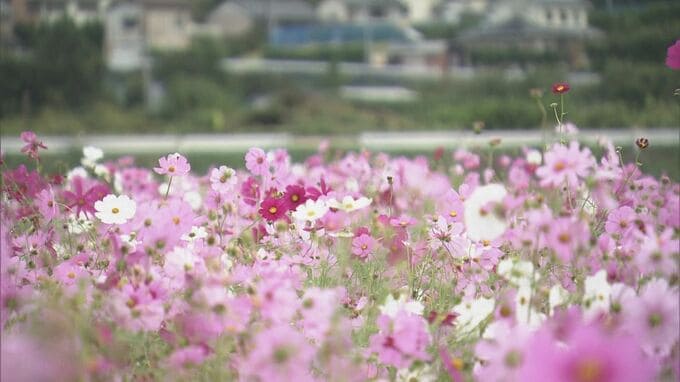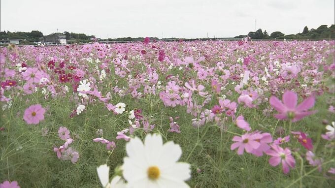 花は今月初めに開花し、きれいに咲きほこった白やピンクの花が、のどかな田園に彩りを添えています。コスモスの花は来月中頃まで楽しめるということです。