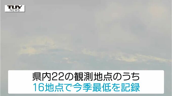 けさは県内各地で冷え込み、最低気温は大蔵村肘折で2.4度、真室川町差首鍋で3.1度、金山で3.5度となるなど10月下旬から11月下旬並みの寒さとなり、県内22ある観測地点のうち16地点で今季最低を記録しました。