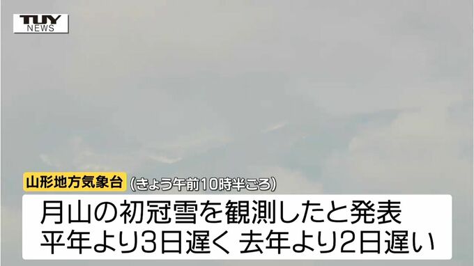 山形地方気象台はきょう午前10時半ごろに月山の初冠雪を観測したと発表しました。平年より3日遅く去年より2日遅い観測です。