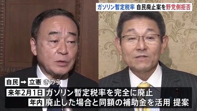 ガソリン税の暫定税率をめぐっては、自民党側がきのう、来年2月1日に完全に廃止し、年内は暫定税率を廃止した場合と同額の補助金を活用することで実質的に廃止することを立憲民主党に提案しました。