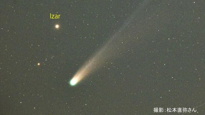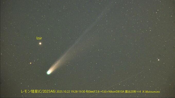 彗星は「ぎょしゃ座のイザール」という星のすぐ下に見え、松本さんは「見たところ尾が北へ3~4°伸びています。写真では(カメラの)400mmの画面を越えて尾が伸びています」と、その様子を報告しました。