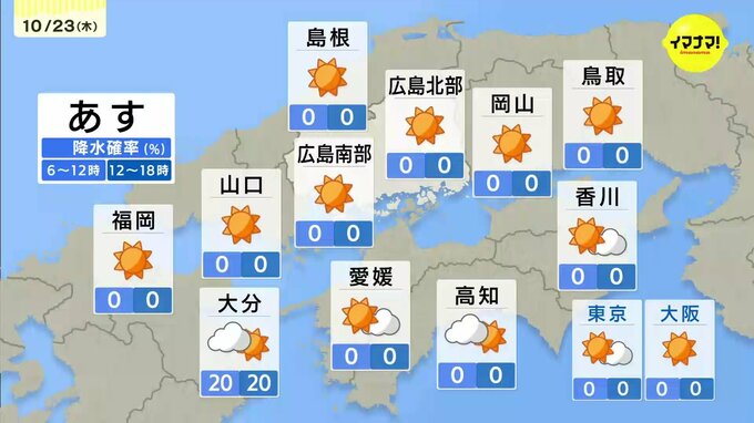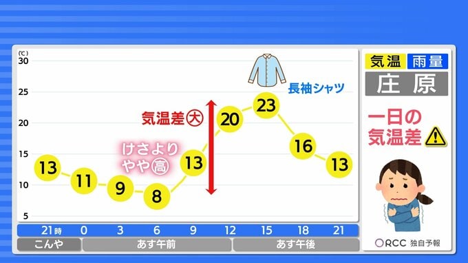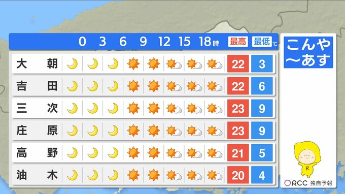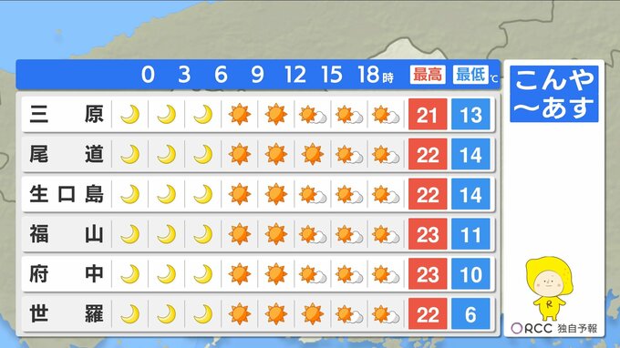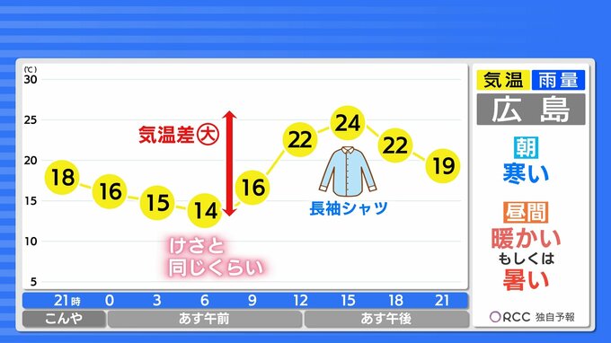 あす朝にかけても引き続きぐっと冷え込みます。最低気温は、けさとだいたい同じくらいの地点が多いでしょう。こんやも暖かくしてお休みください。最高気温は22℃~23℃くらいの地点が多く、広島市中区では25℃の予想です。日中は暖かくなりますが、朝晩は冷えて場所によってはきょう以上に一日の寒暖差が大きくなる見込みです。脱ぎ着しやすい服装でお過ごしください。