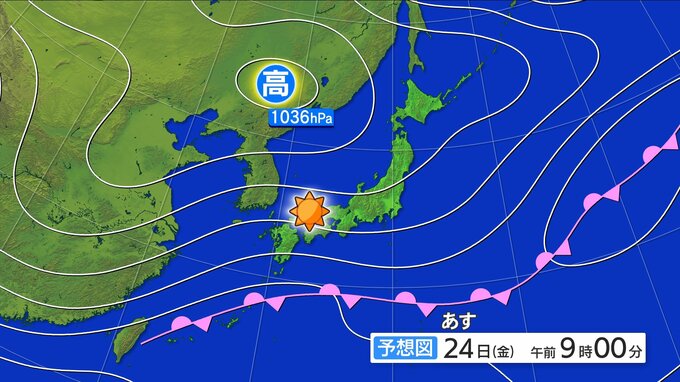 引き続き秋雨前線は本州の南に停滞した状態で、大陸の冷たい空気を伴った高気圧が張り出し秋晴れの空が広がるでしょう。あすは絶好の洗濯日和、行楽日和になるでしょう。あすのうちに厚手の布団など外干ししておいた方が良いでしょう。空気が引き続き乾燥するため火の取り扱いにはご注意ください。