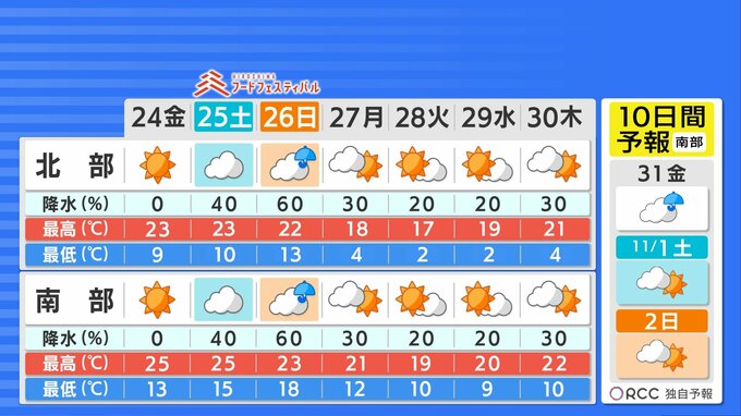秋晴れはあすまでで、週末はすっきりせず雨が降りやすくなるでしょう。最高気温は、週末まで20℃を大きく超える日が多く、日差しのもとでは暖かく、もしくは暑くなりそうです。来週になると最高気温は20℃前後の予想で、朝晩はぐっと冷えて一日の寒暖差が大きいでしょう。