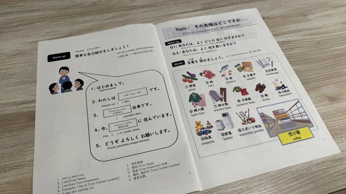山藤さんの「にほんごカフェ」では日常のシーンを切り取って教科書が作られていますが、この日は「買い物」をテーマに、会話形式でレッスンが行われました。