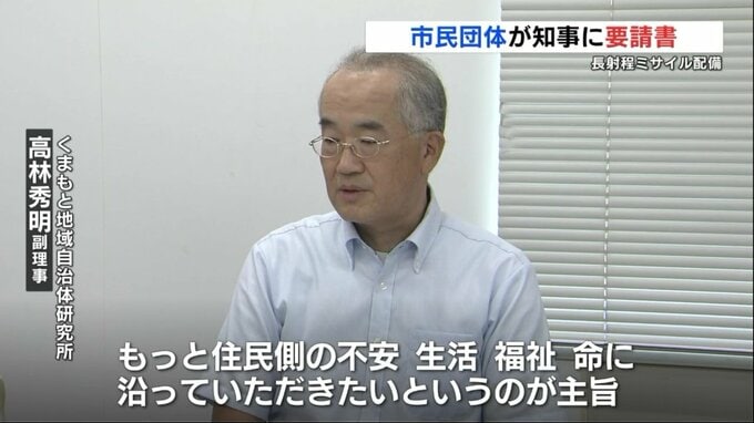 熊本市にある陸上自衛隊・健軍駐屯地への長射程ミサイルの配備について、市民団体が知事に対する要請書を提出しました。要請書を県職員に手渡したのは、熊本県民の暮らしについての問題などを研究している市民団体…