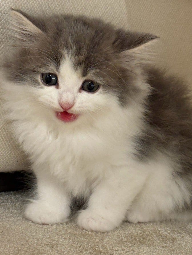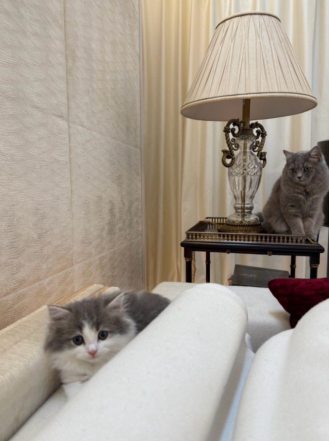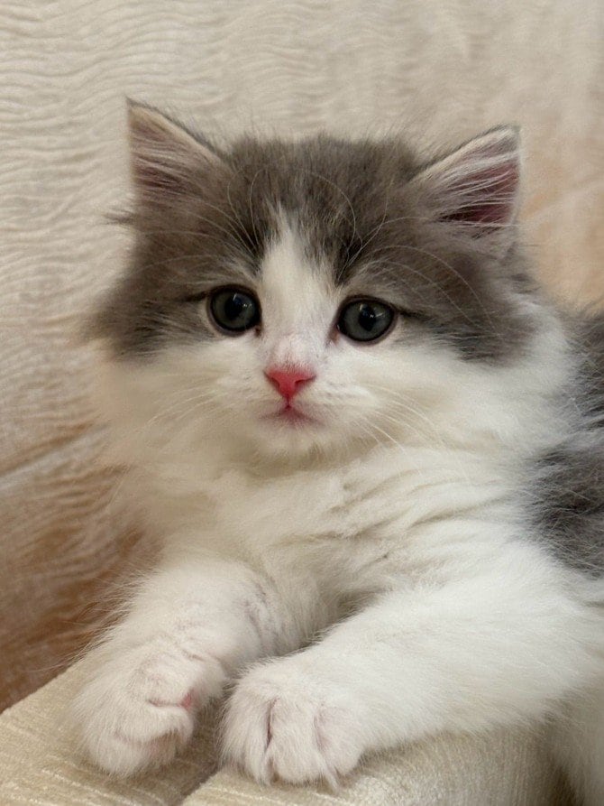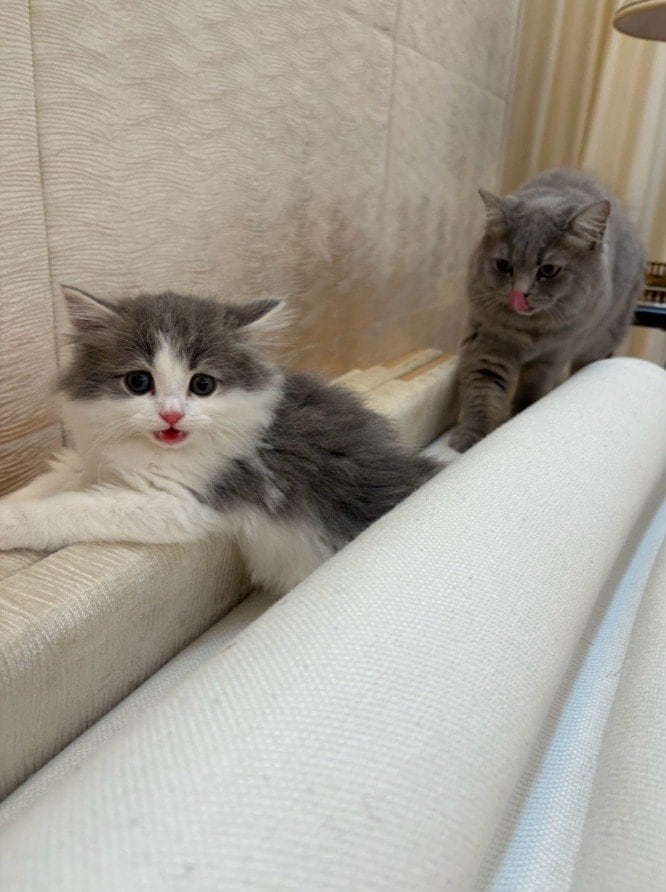 ブログに掲載された複数の写真には、白と灰色の長毛の子猫ラヴィくんが写っています。ふわふわした毛並みと丸くふっくらとした顔が特徴的で、ソファに前足を伸ばした姿など可愛らしい表情が捉えられています。