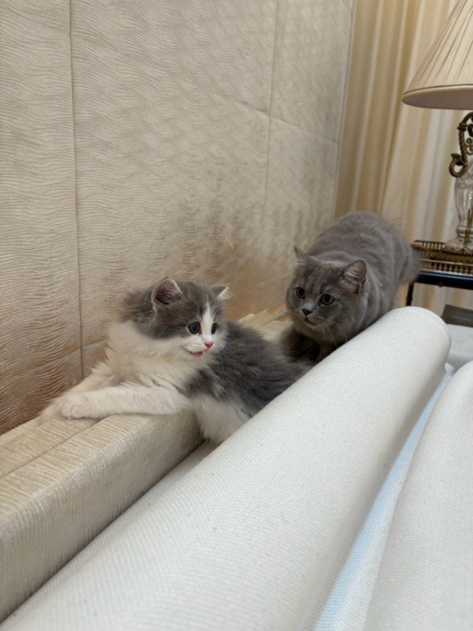 高橋さんは、21日の投稿でサイベリアンの子猫「ラヴィくん」を家族に迎え入れたことを報告。「ラヴィくん ミーちゃんの本当の弟くん」と紹介。先住猫の「みーちゃん(ミルリィちゃん)」との対面の様子も伝えています。