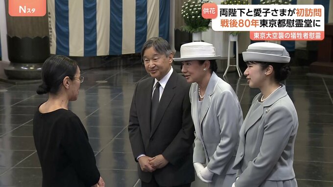 「戦後80年」にあたり、天皇ご一家が初めて東京都慰霊堂を訪問されました。天皇皇后両陛下と長女・愛子さまは、午後2時ごろ、東京・墨田区の「東京都慰霊堂」に到着し、小池都知事らの出迎えを受けられました。慰…