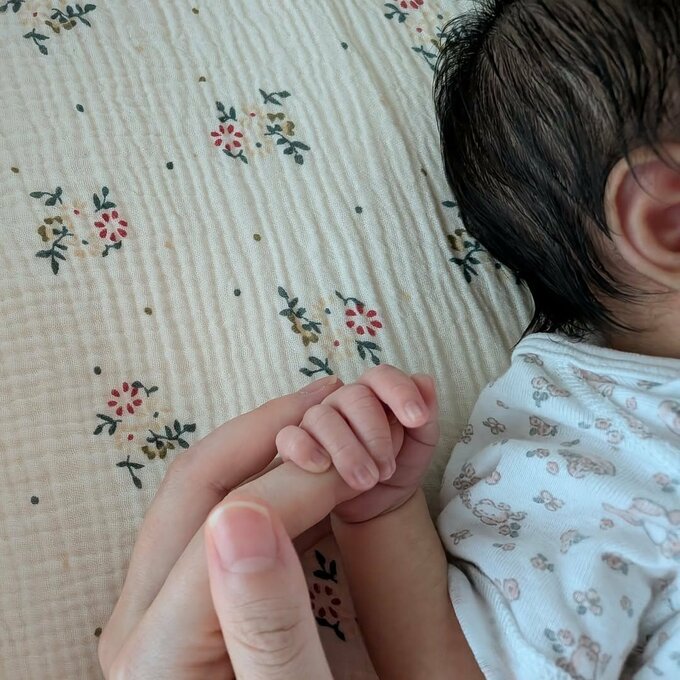 投稿では赤ちゃんの小さな手を大人の手が優しく握る写真も公開されており、布団の上での温かな親子の瞬間が捉えられています。