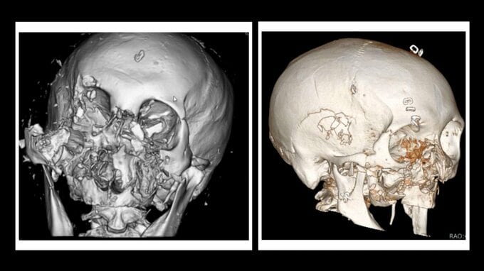 クマに襲われた患者のCT画像では、顔の骨が激しく砕けているのが分かります。
