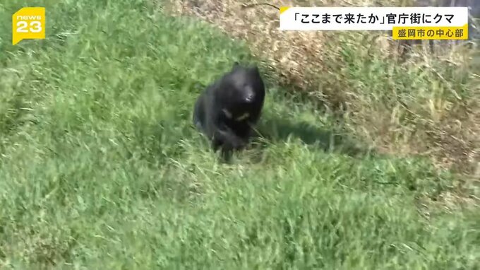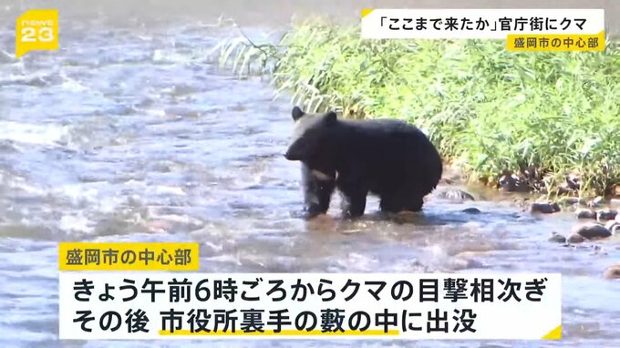 岩手県盛岡市の中心部にクマが出没しました。駆けつけた警察が警戒する中、川沿いを動き回ります。