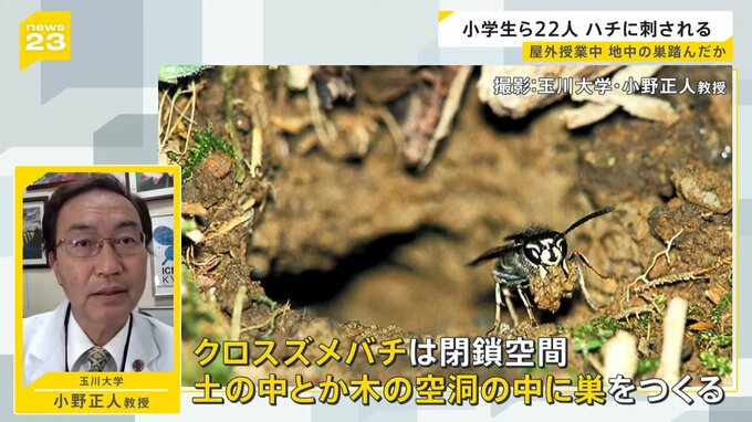 「ハチの巣は木の枝とか家の軒下など目につくところにあるのが一般的。クロスズメバチは閉鎖空間、土の中とか木の空洞の中に巣をつくる。ハチ自体の大きさも小さいので、出入りしているハチも目に留まらないし、ハエかアブみたいなものが飛んでいる程度に子どもたちが思ってしまうと、落ち葉を手でどけてしまって、ハチの方がびっくりして攻撃を仕掛けてしまう」