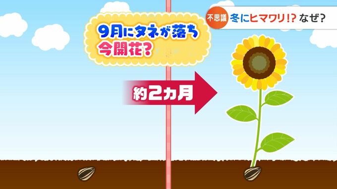 ヒマワリは、タネからおよそ2か月で開花するのが一般的なので、9月ごろに落ちたタネがゆっくり成長して開花した、と考えられるそうなんですが、問題は…」