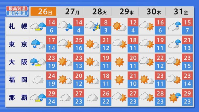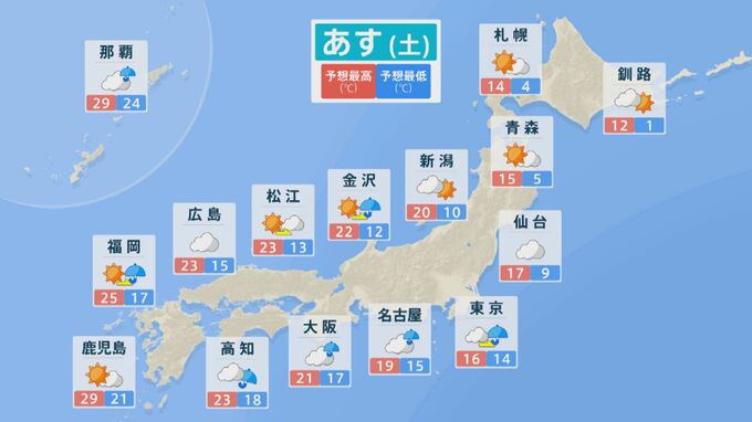 25日は、太平洋側を中心に雲の広がる天気になりそうです。東京の予想最高気温は16度と平年より4度ほど低くなるでしょう。
