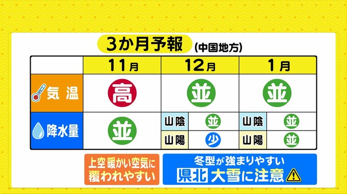 気象庁が発表している最新の3か月予報によりますと、11月から1月の3か月間の気温は平年並から平年より高い傾向で、降水量は山陰でほぼ平年並 山陽では平年並か少ない見込みです。月ごとに見ますと、11月の気温は平年より高い予想です。ただ、基準となる平年並の気温が下がっていくため、体感では日中も徐々に寒さを感じるようになるでしょう。