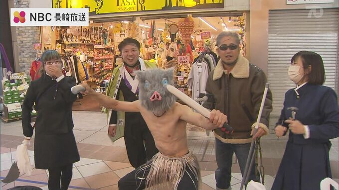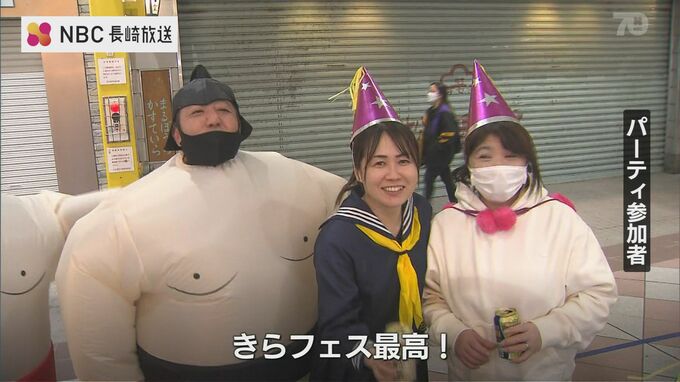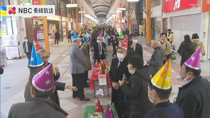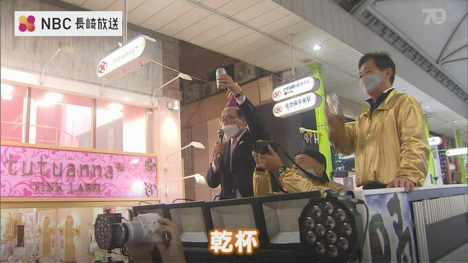 佐世保市中心部のアーケードを会場にした「きらきらチャリティ大パーティ」が8日、3年ぶりに開かれ、800人が一斉に乾杯しました。
