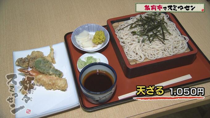 川口さんは【天ざる】(1050円)を注文。天ぷらは、エビ、ピーマン、キノコなど。到着するやいなや川口さん、大きな音を立ててお蕎麦をすすります。
